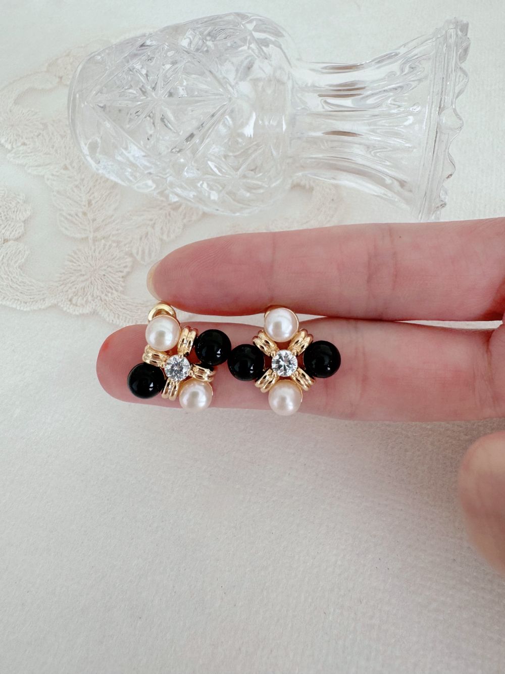 Maillard style black agate, pearl and inlaid zircon earrings – brass plated with 18k gold